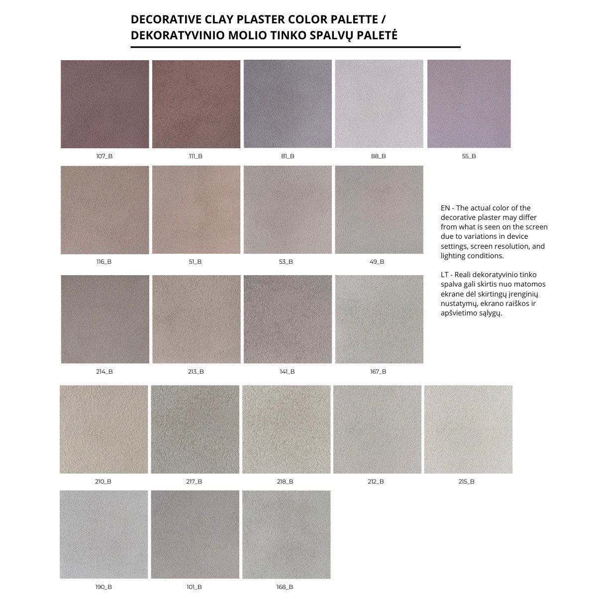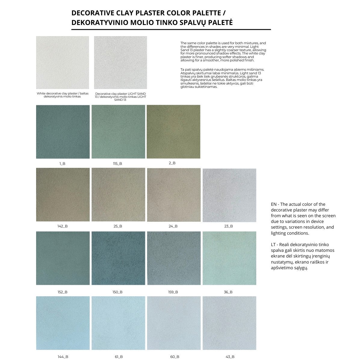 There is no separate color palette for Finish No. 9 clay–marble putty — when selecting colors, use the decorative white clay plaster color palette as a reference. The shades are not identical, but very closely related. To be certain about the color, we recommend purchasing a 500 g sample pack for testing.