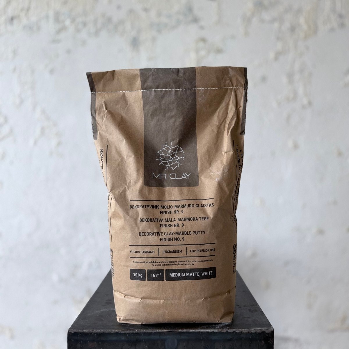 Mr. Clay clay–marble putty FINISH No. 9 is intended for use only on Mr. Clay decorative clay plasters when performing various artistic decorative techniques. The product is natural and vapor-permeable, absorbs liquids, and is therefore suitable only for dry rooms where there is no direct contact with water, dirt, or grease. To improve durability and performance, additional varnishing is required.