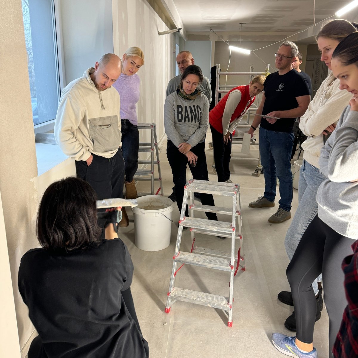 As with all of our training sessions, we started with the theoretical part – we reviewed wall preparation issues, emphasized how to mix the paste correctly, and demonstrated this in practice. We also discussed what tools should be used for plastering and which ones should be avoided. Finally, we explained step by step how to plaster correctly, then demonstrated this in practice and invited the students to join us at the walls.