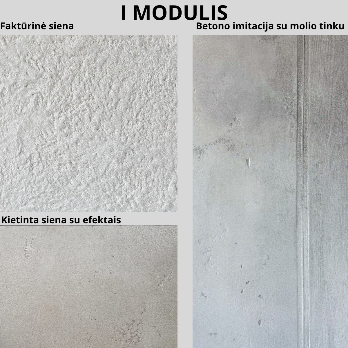 Atliksime 3 dekoratyvines technikas: iškilesnės faktūros, betono imitaciją su molio tinku ir labai glotnią techniką su minimaliais efektais.