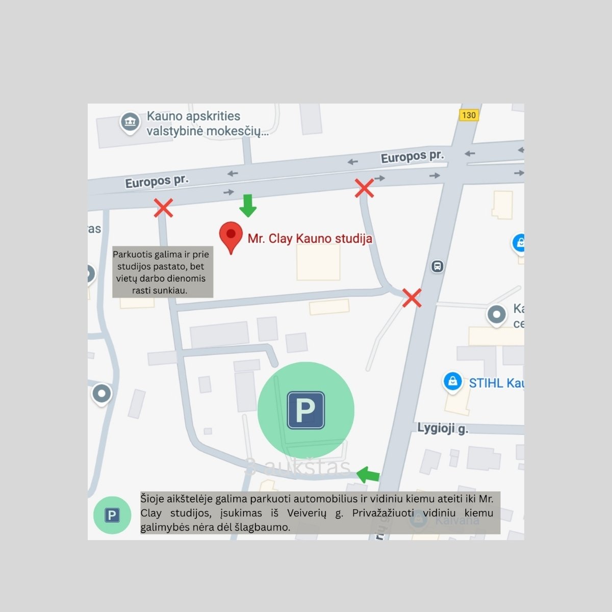 VIETA: Europos pr. 72 E, Kaunas. Į navigaciją veskite "Mr. Clay Kauno studija" ir atves tiesiai į vietą. Eiti per stiklines duris E72, 3 aukštas. Teritorija didelė, todėl atidžiai perskaitykite informaciją apie parkavimą pridėtame žemėlapyje.
